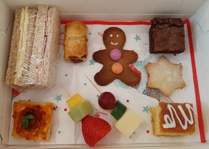 Packed up in their own little box - 2 finger sandwiches (you choose the fillings), sausage roll, mini puff pastry pizza, cheese grape and cucumber stick, fruit stick, gingerbread man, lemon drizzle square, shortbread and a chocolate brownie