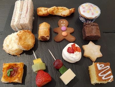 2 finger sandwiches (you choose the fillings), sausage roll, mini puff pastry pizza, cheese stick, fruit stick, cheesy twist, gingerbread man, lemon drizzle square, shortbread, chocolate brownie , fairy cake, mini pavlova and your choice of cheese scone (shown) or a scone with jam and cream