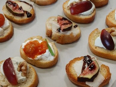 A selection of crostini from Ricotta roast tomato & basil, Cambazola grape & walnut, Fig pecorino & balsamic, Lemon chicken & avocado. 2 pp