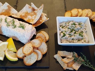 Smoked mackerel parsley and horseradish dip with thyme flavoured pitta chips and crostini. Serves 12-14