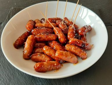 Sticky sausages roasted in hoisin sauce wholegrain mustard and honey. 2-3pp